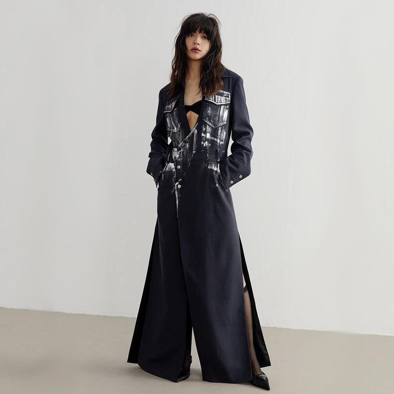 Women's Navy Irregular Slit Long Blazer