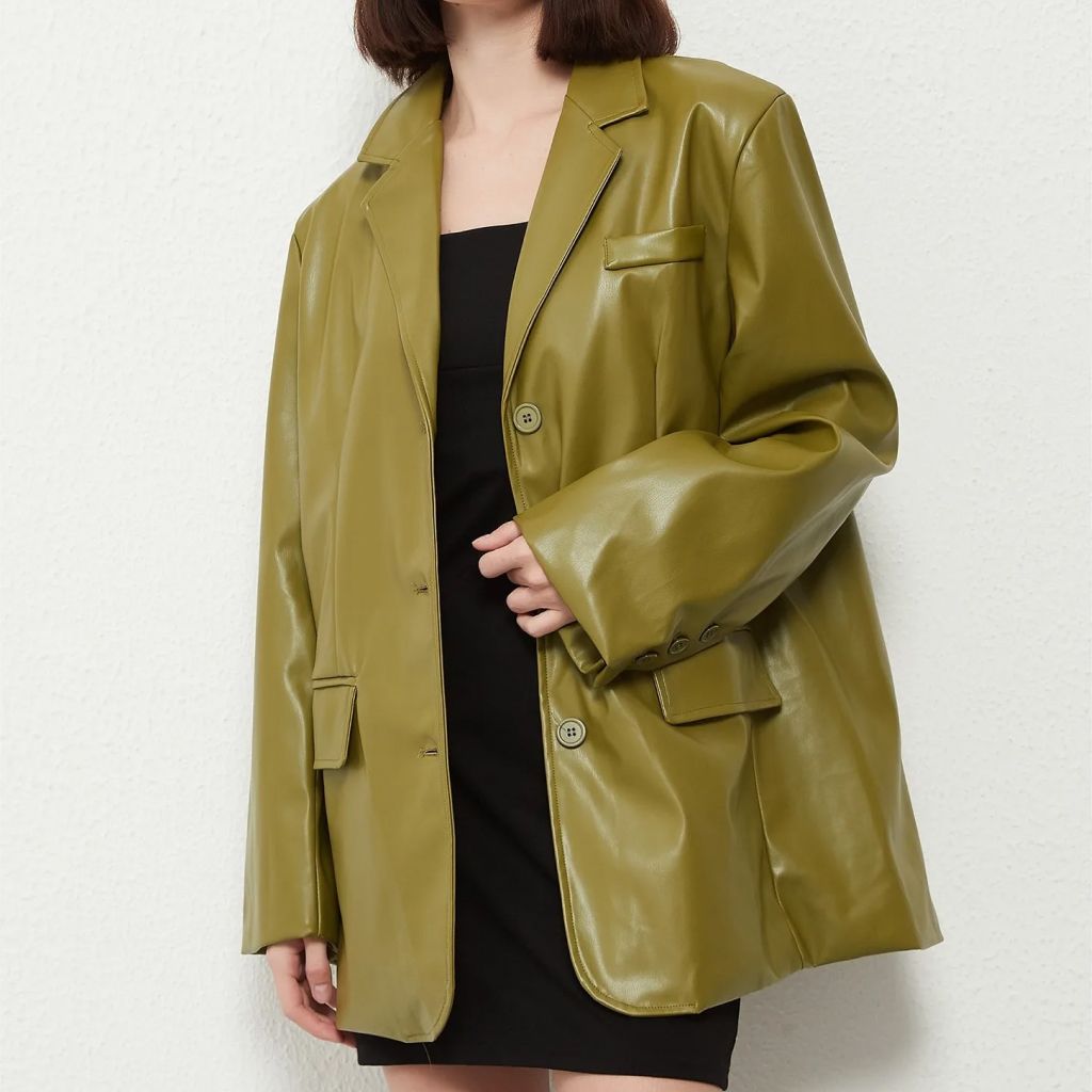 Leather Blazer Coat - Vintage Green Single Breasted