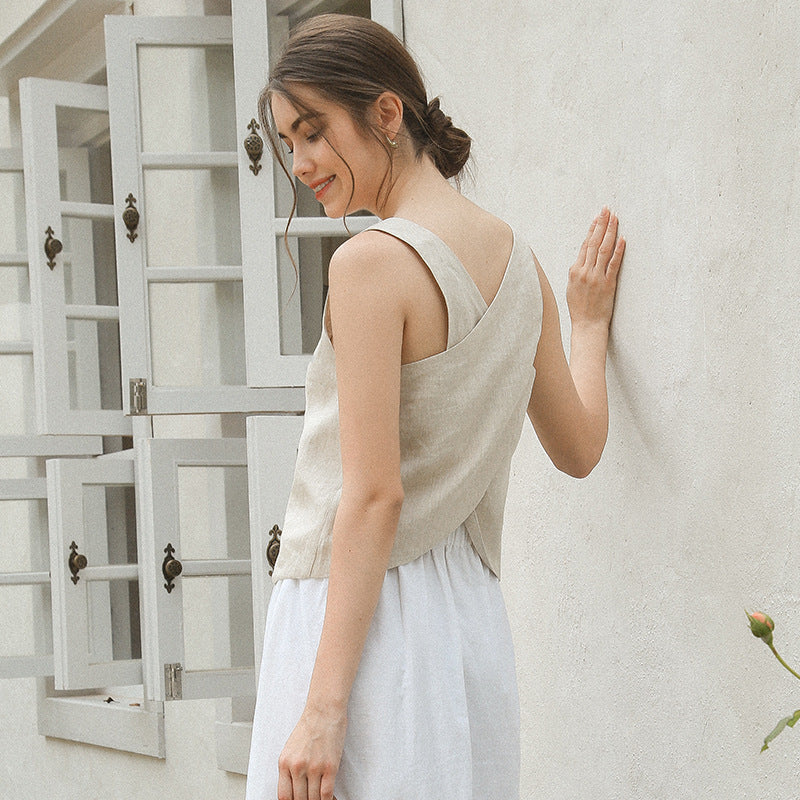 Elegant Beige Linen Blend Blouse with Three-Quarter Raglan Sleeves for Summer