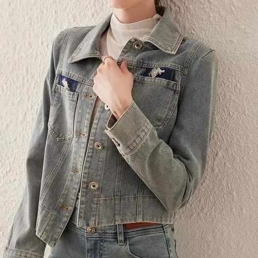 Spring Retro Washed Denim Jacket with Turn Down Collar