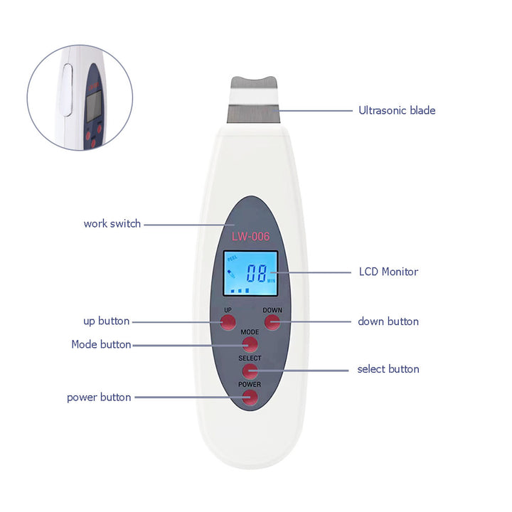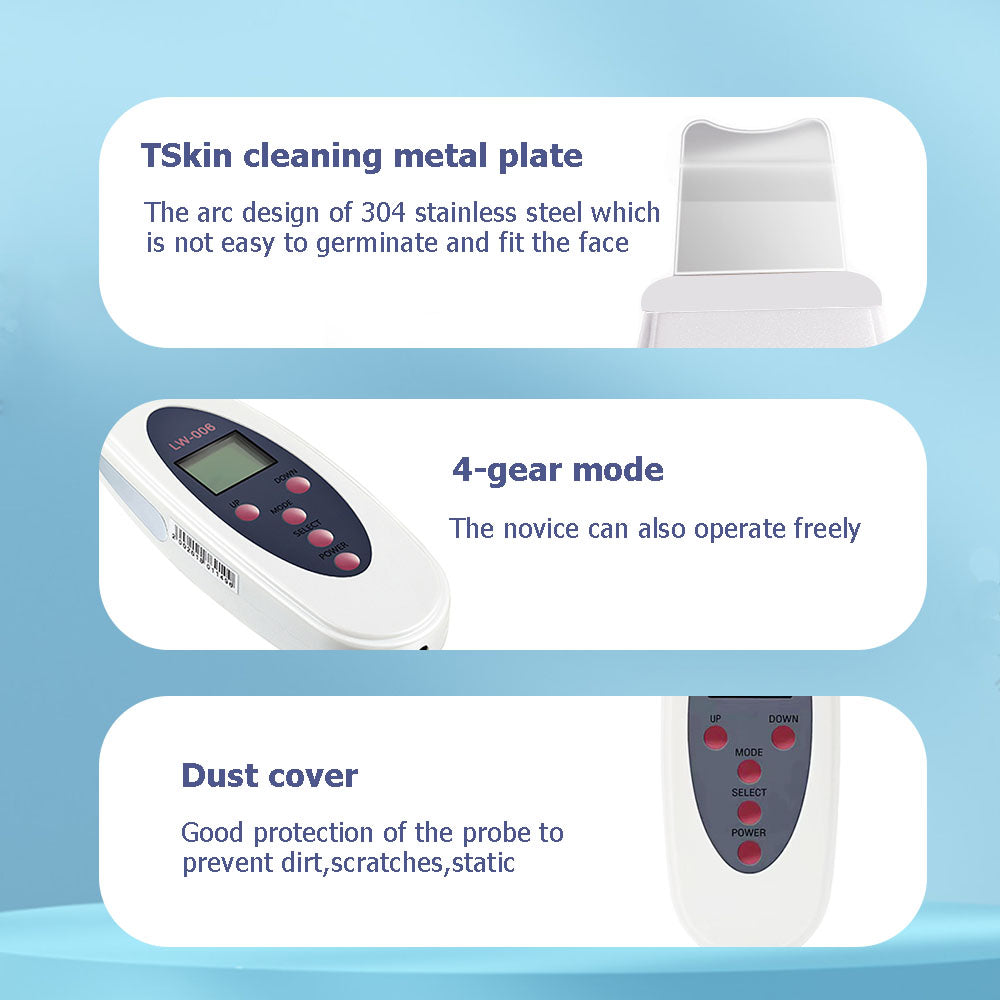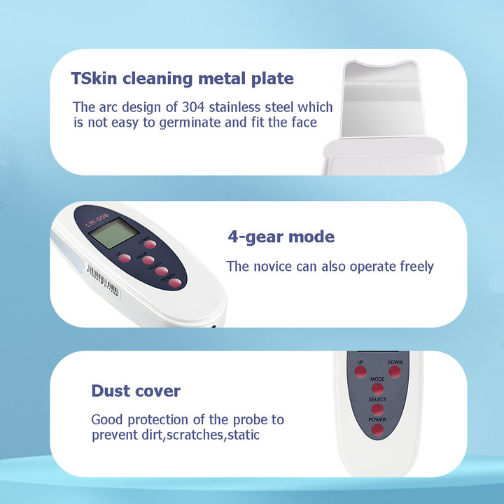 Our Ultrasonic Skin Scrubber is equipped with high-speed vibration technology, using 25,000 vibrations per second to effectively cleanse and exfoliate your skin. The stainless steel probe is gentle yet powerful, ensuring safe and non-irritating treatment. The device offers four distinct working modes—PEEL, TONE, CLEAN, and LIFT—each designed to address specific skincare needs, from removing dead skin cells to promoting deep absorption of skincare products.- High-Frequency Vibration: 25,000 vibrations per second for deep cleaning and exfoliation.