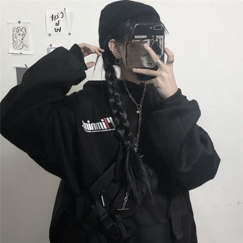 Women's Long Pullover Long-sleeved Hooded Loose Black And Gray Color Matching Double-sided Velvet Fleece Sweatshirt