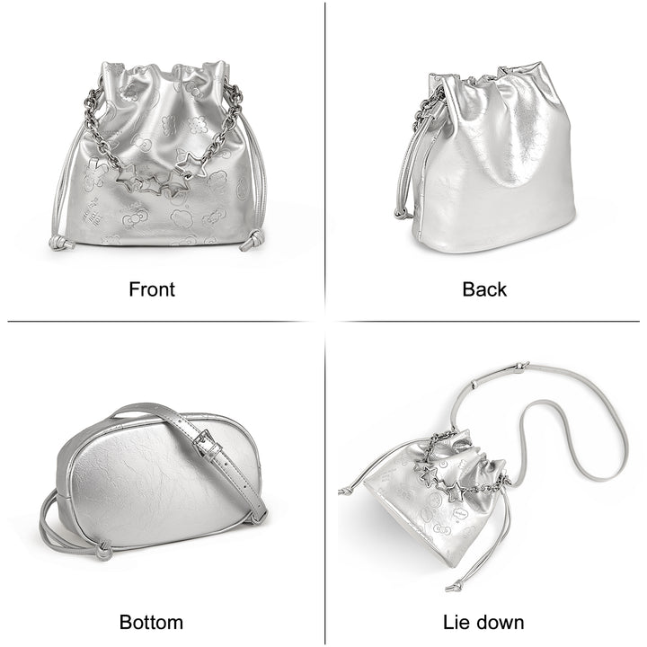 Crafted from high-quality microfiber synthetic leather, this small bucket bag features a soft, supple texture that feels luxurious and durable. The solid exterior showcases a delightful cartoon print, making it a fun and eye-catching addition to your wardrobe. With its drawstring closure and star chain detailing, this bag offers a trendy look while ensuring your essentials are securely stored.