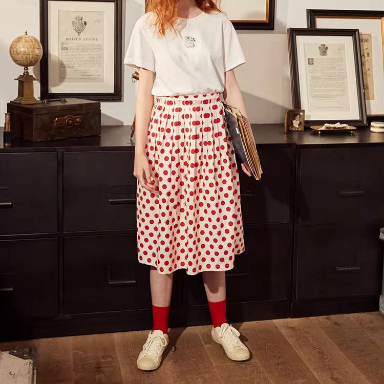 Women's Polka Dot A-line Cotton Skirt with Elastic Waist and Button Decoration