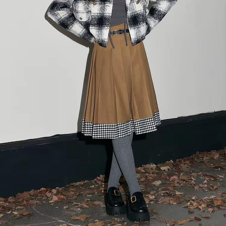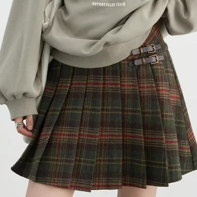 High Waist Wool Plaid A-line Pleated Skirt for Spring and Autumn