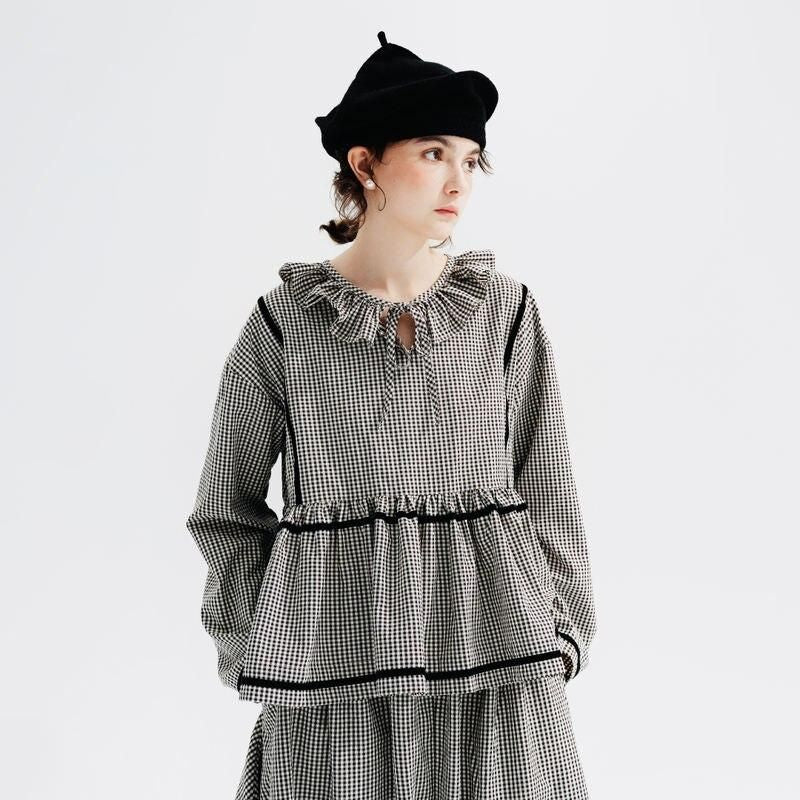 Black & White Checkered Long-Sleeved Shirt with Doll Collar