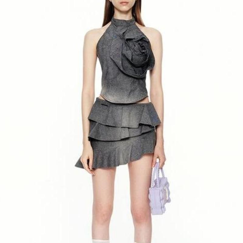 Vintage-Inspired Irregular Rose 2-Piece Skirt Set - Y2K Halter Top and Ruffle Denim Mini
