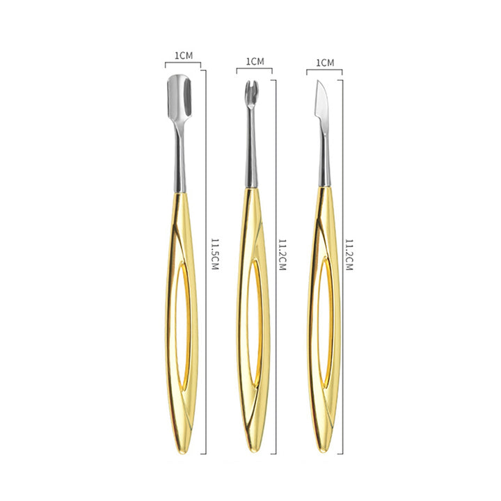 Using our Gold Stainless Steel Cuticle Pusher and Nail File offers numerous benefits for maintaining healthy, beautiful nails. The precise cuticle pusher helps remove dead skin and push back cuticles, promoting healthier nail growth. The nail file allows you to shape your nails to your desired length and style, ensuring a polished and professional finish. This tool is essential for achieving a clean and tidy look, enhancing the overall appearance of your nails.- Promotes healthier nail growth by removing dead skin