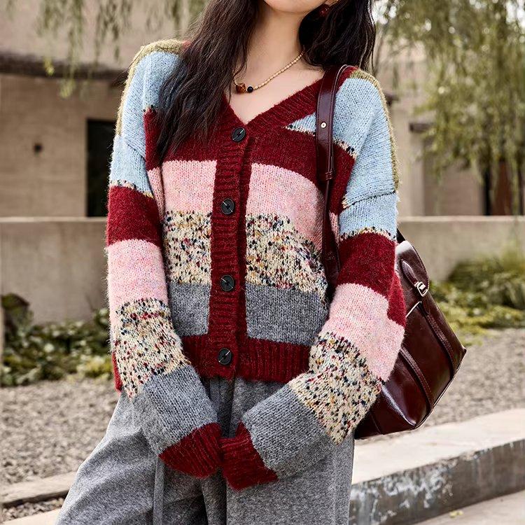 Colorful Striped Knitted Cardigan for Women - Loose Casual V-Neck Sweater