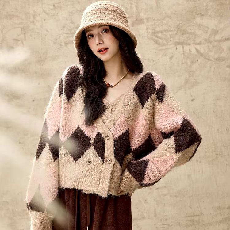 Women's Plaid Tweed V-Neck Cardigan Sweater - Fake Two-Piece Knitted Fall & Winter Sweater