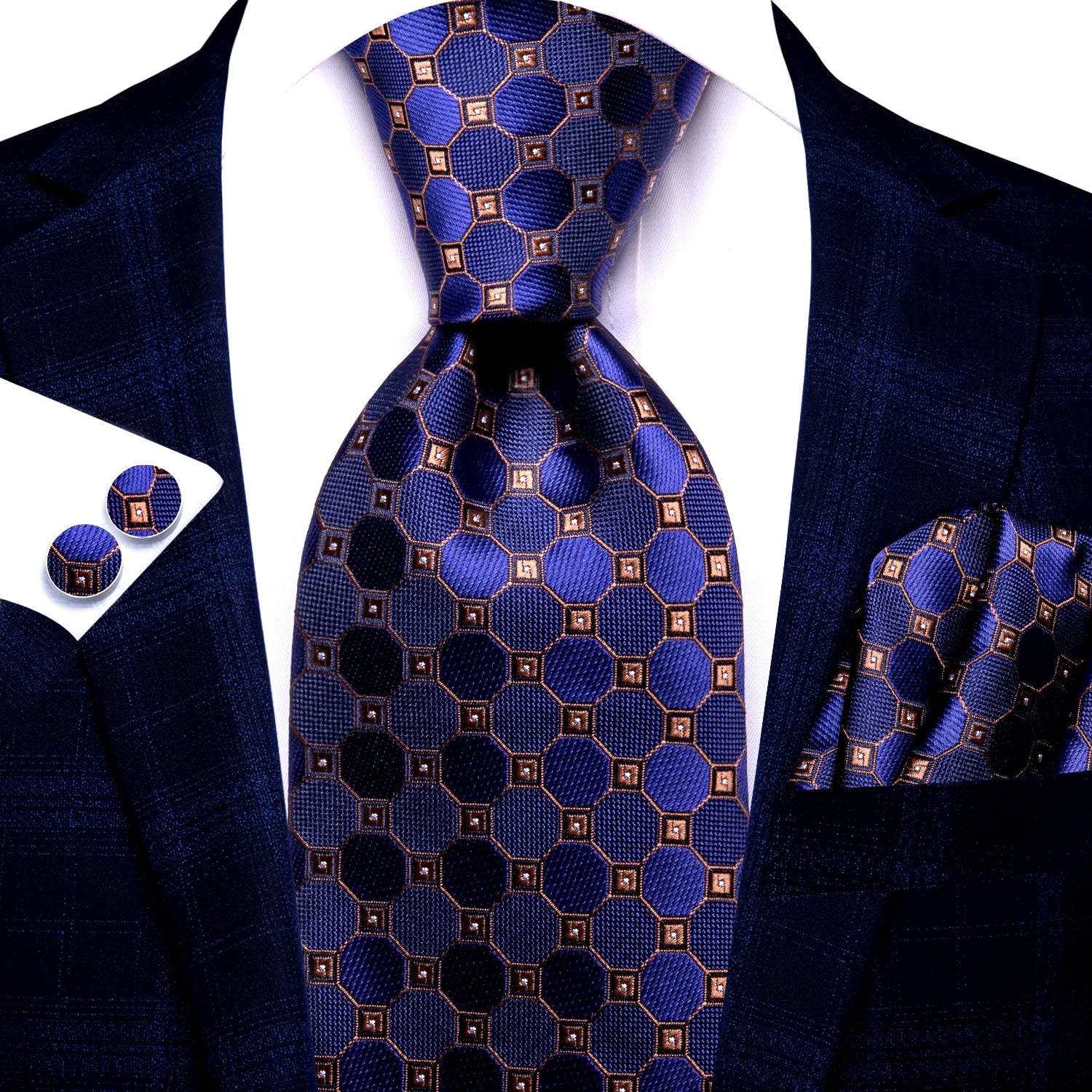 Navy Blue and Gold Plaid Silk Necktie Set with Cufflinks & Pocket Square for Men