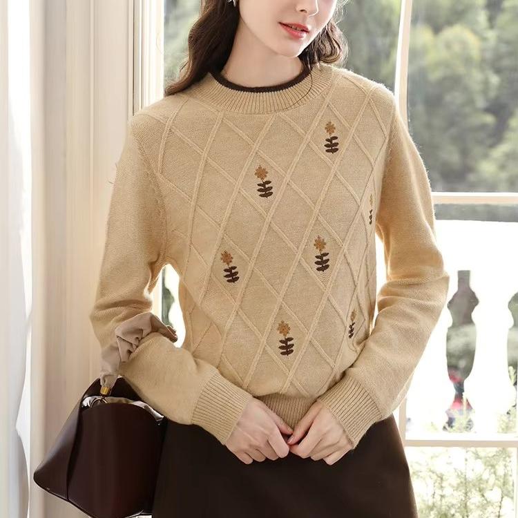 Cozy Khaki Embroidered Crew Neck Knit Sweater for Women - Autumn/Winter 2024
