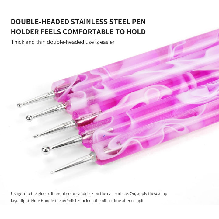 Transform your nail art game with our 5 Pcs Nail Art Dotting Pen Set. Designed for both professionals and home users, these dual-ended pens are perfect for creating intricate designs, picking rhinestones, and adding stunning details to your manicures. Whether you're a seasoned nail artist or just starting out, this set will help you achieve salon-quality results effortlessly.High-Quality Design and Materials