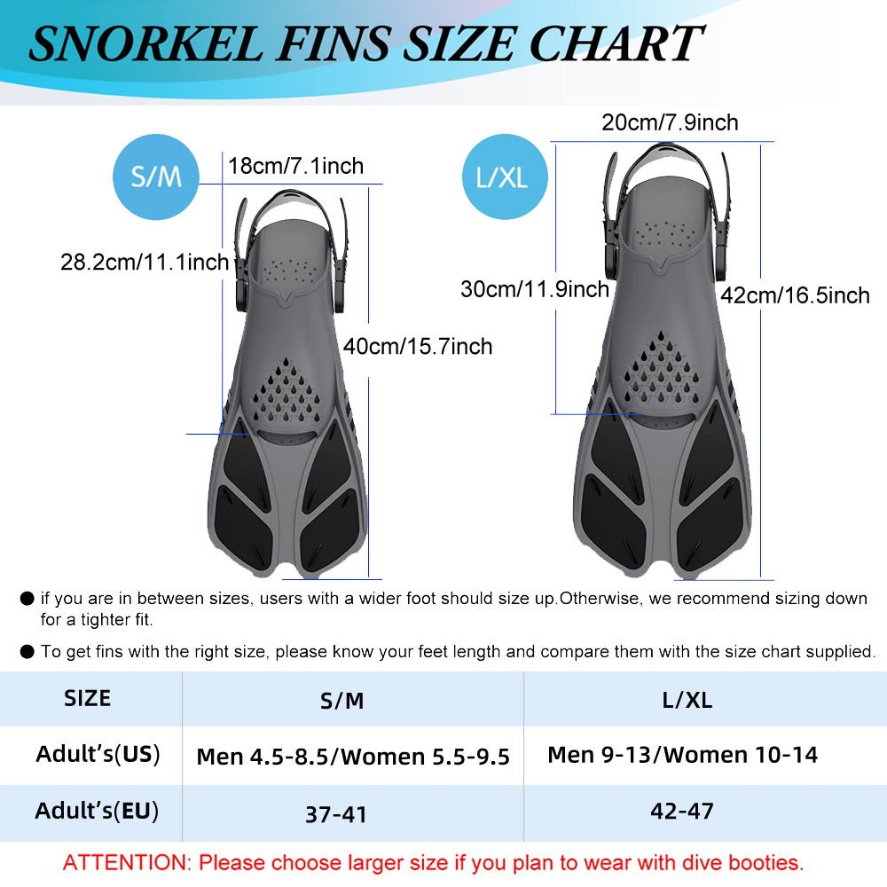 With their innovative features and thoughtful design, our snorkel fins minimize fatigue and maximize fun during your aquatic adventures. Say goodbye to discomfort and hello to endless underwater exploration with our Adjustable Open Heel Snorkel Fins. Order yours today and dive into a world of excitement!