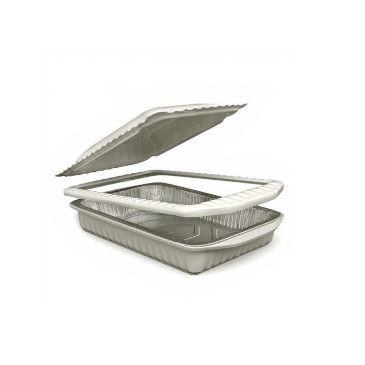 This system locks your foil pan in place to reduce spills. Its heat-resistant plastic handles allow you to carry it safely. The lid snaps securely in place, sealing in heat and preventing spills.