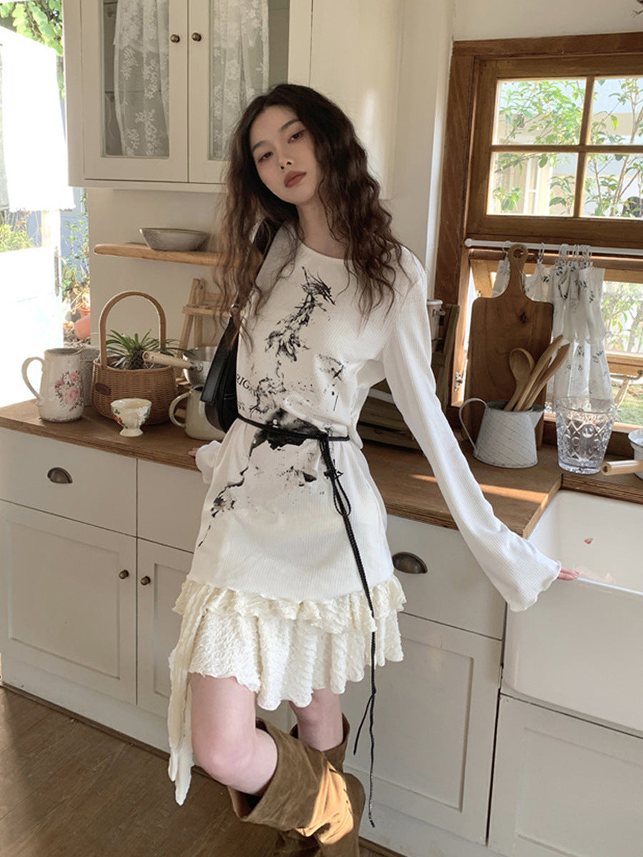 Printed Knitted T-shirt High Waist Short Irregular Skirt Two-piece Set