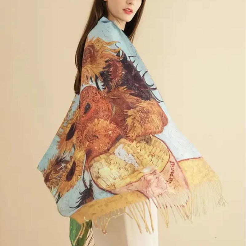 Sunflower Print Cashmere Shawl - Luxury Van Gogh Inspired Pashmina Wrap