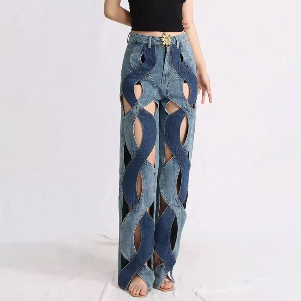 High Waist Hollow Out Chain Spliced Slim Flare Jeans