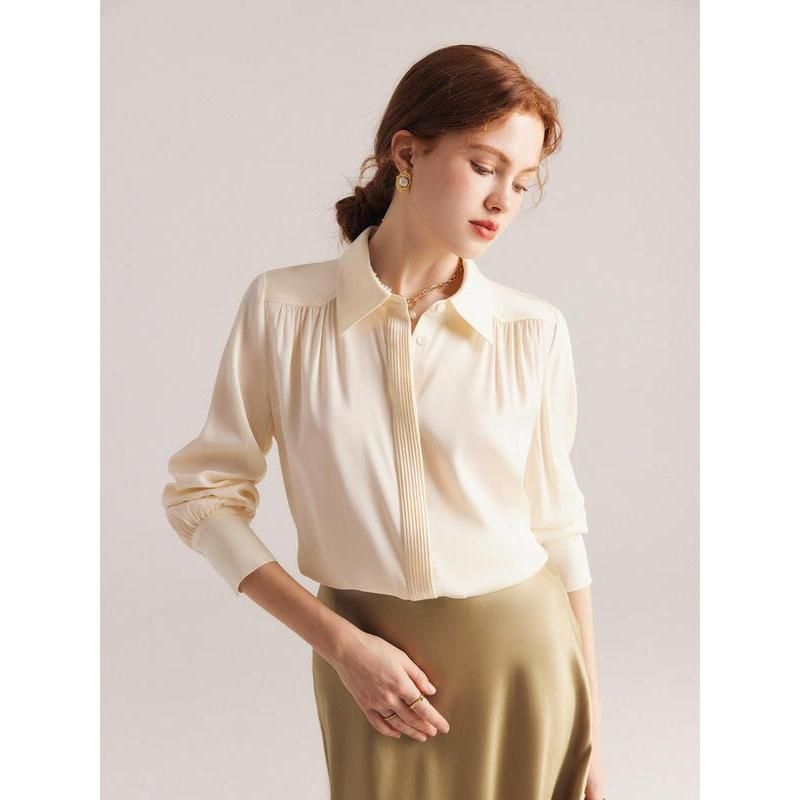 Experience the luxurious touch of our blouse, crafted with a high-quality blend of 90% Mulberry silk and 10% Spandex. This exquisite combination ensures both comfort and durability, offering a slight stretch for the perfect fit. The thin, breathable fabric makes it suitable for any season, providing a seamless blend of warmth and coolness.