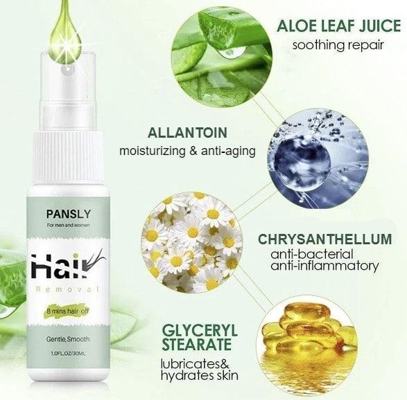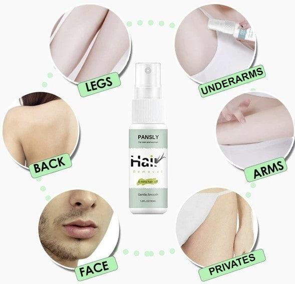 No more shaving or painful waxing. Our Hair Removal Spray allows you spray and wipe for immediate hair-free skin anywhere -- from legs to armpits and face.